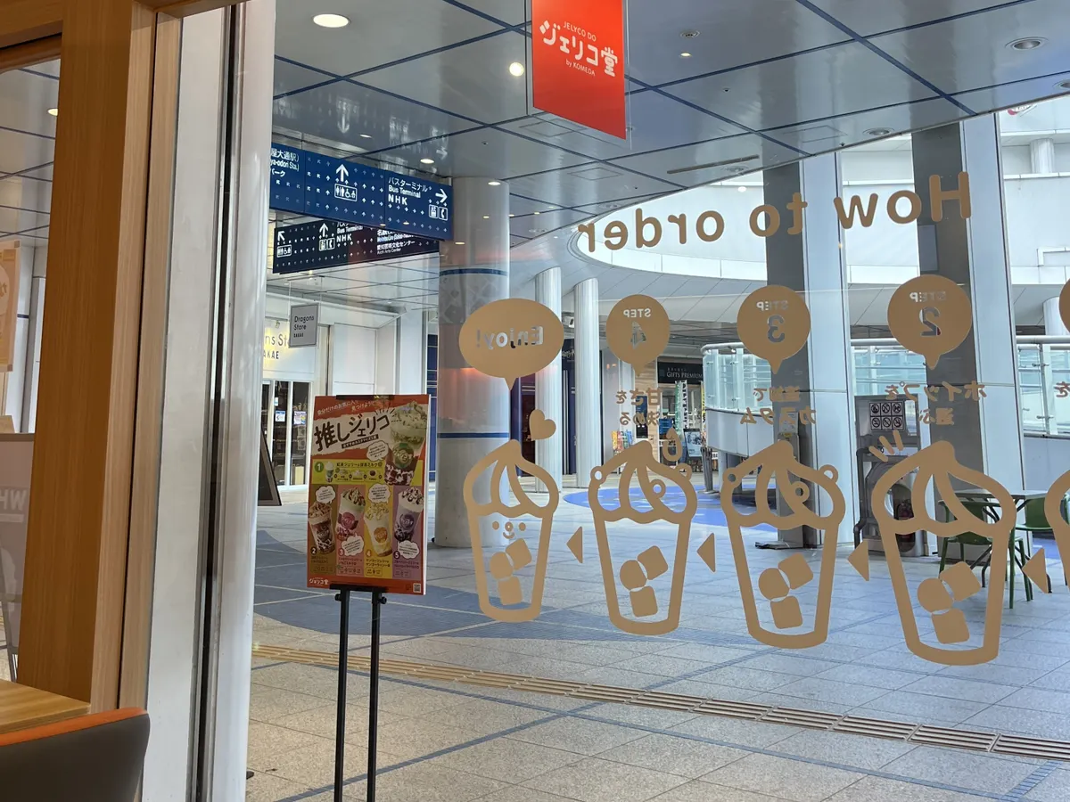 待っているあいだ、一度外を向きました。ブルーを基調とした広場にジェリコ堂のオレンジが映えていました。