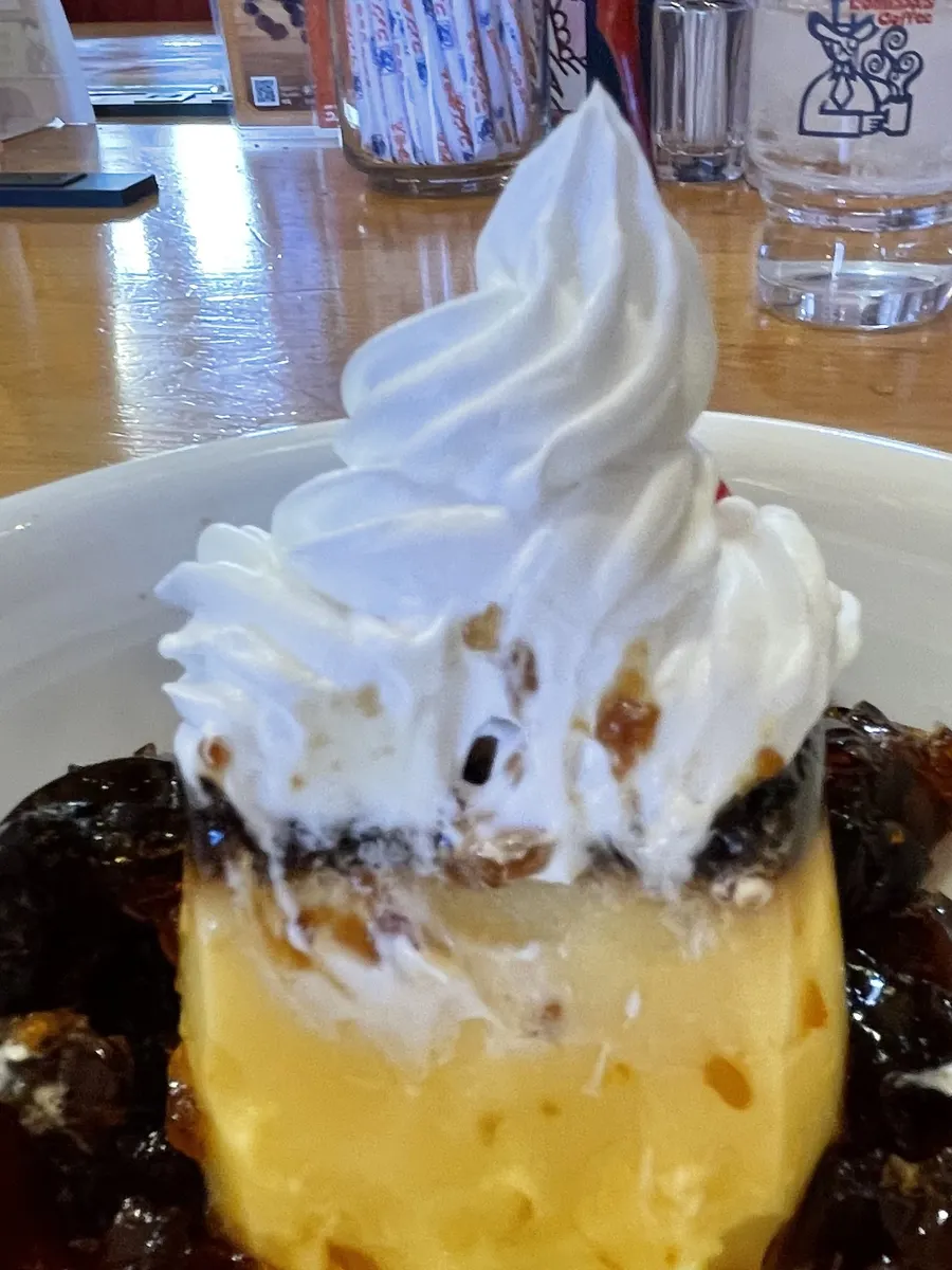 プリン上のホイップがソフトクリーム巻き❗🍦🍮