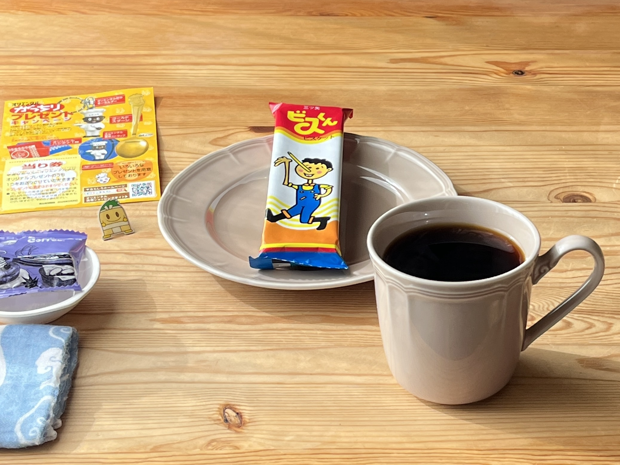 身体機能に困難が生じたひとのためにコメダのとろみコーヒーがあるように、認知症になったひとも介護をするひとも、お店でくつろいで、おいしいコーヒーが飲めるといいなと思います。お菓子はといえば、スーパーでポッキーをたくさん見たのと、篠原橋で本社と工場を見たことから、ポッキーではなく、中川区が誇る三ツ矢のビスくんを買ってきました。