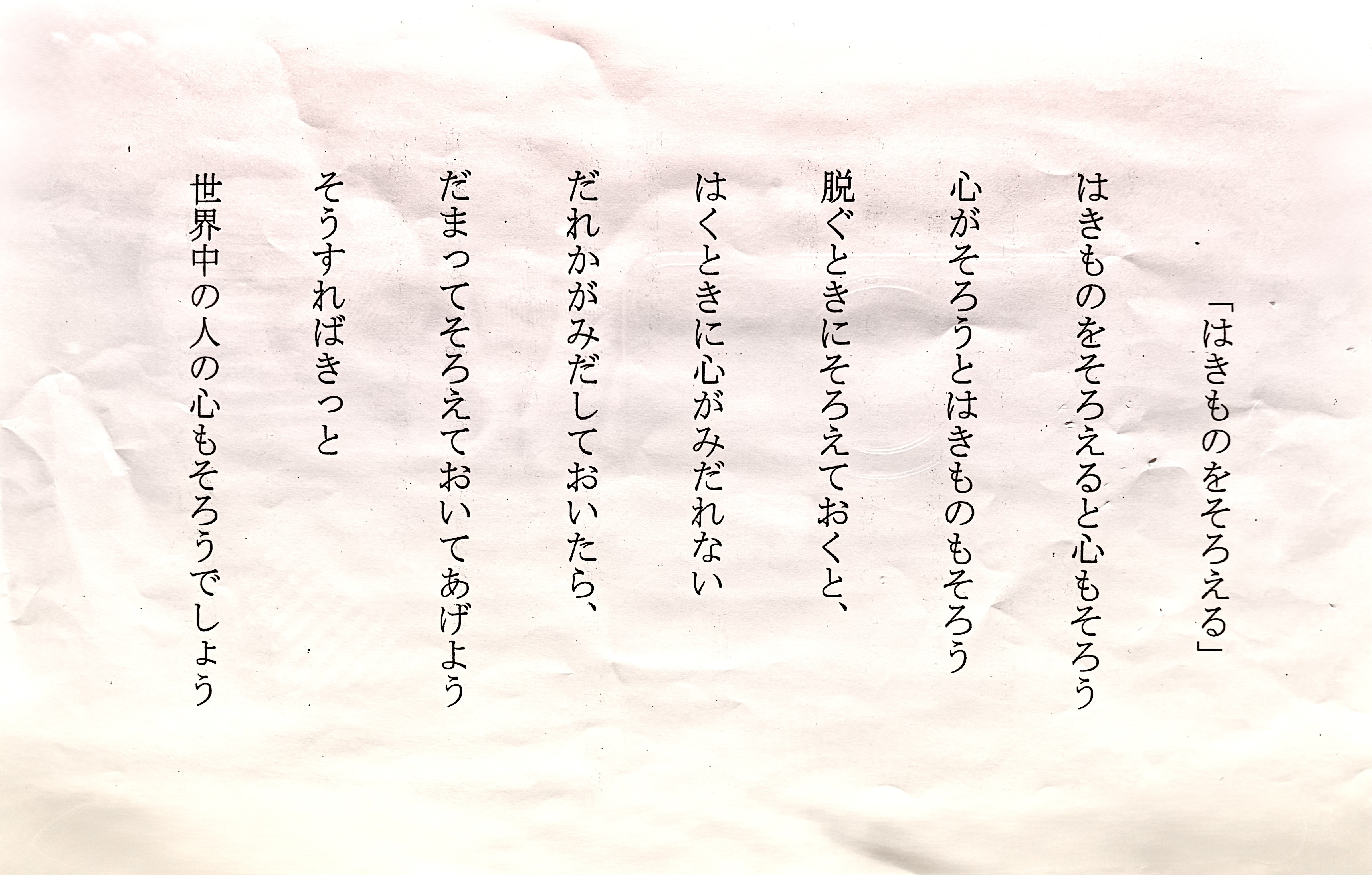 これは先日の夜に通りすがりに偶然見つけたのですが・・・ 長野県にある お寺の住職が読んだ "詩" です 何を訴えようとしたかを考えて見ました 自分の靴をそろえずに脱ぎっぱなしにするという行動は後から来る人のことを考えていない訳で 反対に自分の靴をそろえることができる人って言うのは 自分の行動を客観的に見る事が出来る人なので 他の人が乱した靴を黙ってそろえることができる人でもあると思うのです(これは、靴だけに限ったことではなく全てのことに言えるのではないでしょうか? )一人一人が自分のことを落ち着いて見つめたり考えたりして行動することはとても大切なことだと思うのです しかも自分の事だけでなく他の人のことも考える優しさがあれば自ずと円滑な人間関係を築くことが出来るはずですよ