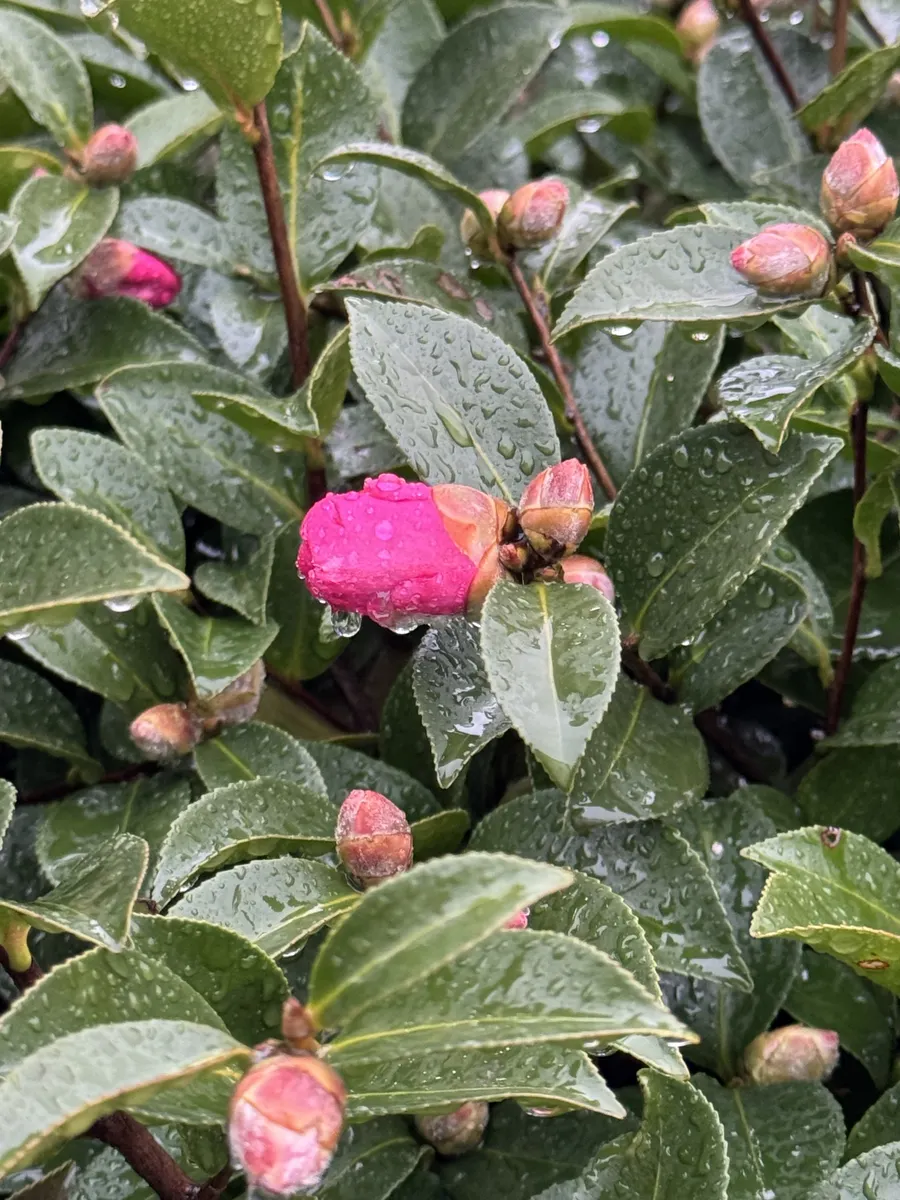 最近気になる植え込みの遅咲き(?)サザンカ、恵みの雨に濡れながら鮮やかに咲き始めました🌸。