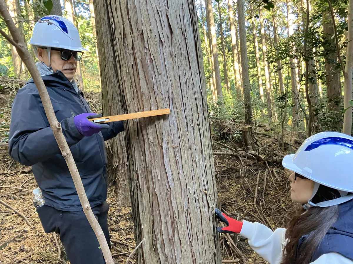 散策が終わった後は木の幹の太さを測って、その木が年間に吸収するCO2の量を計算していただきました。