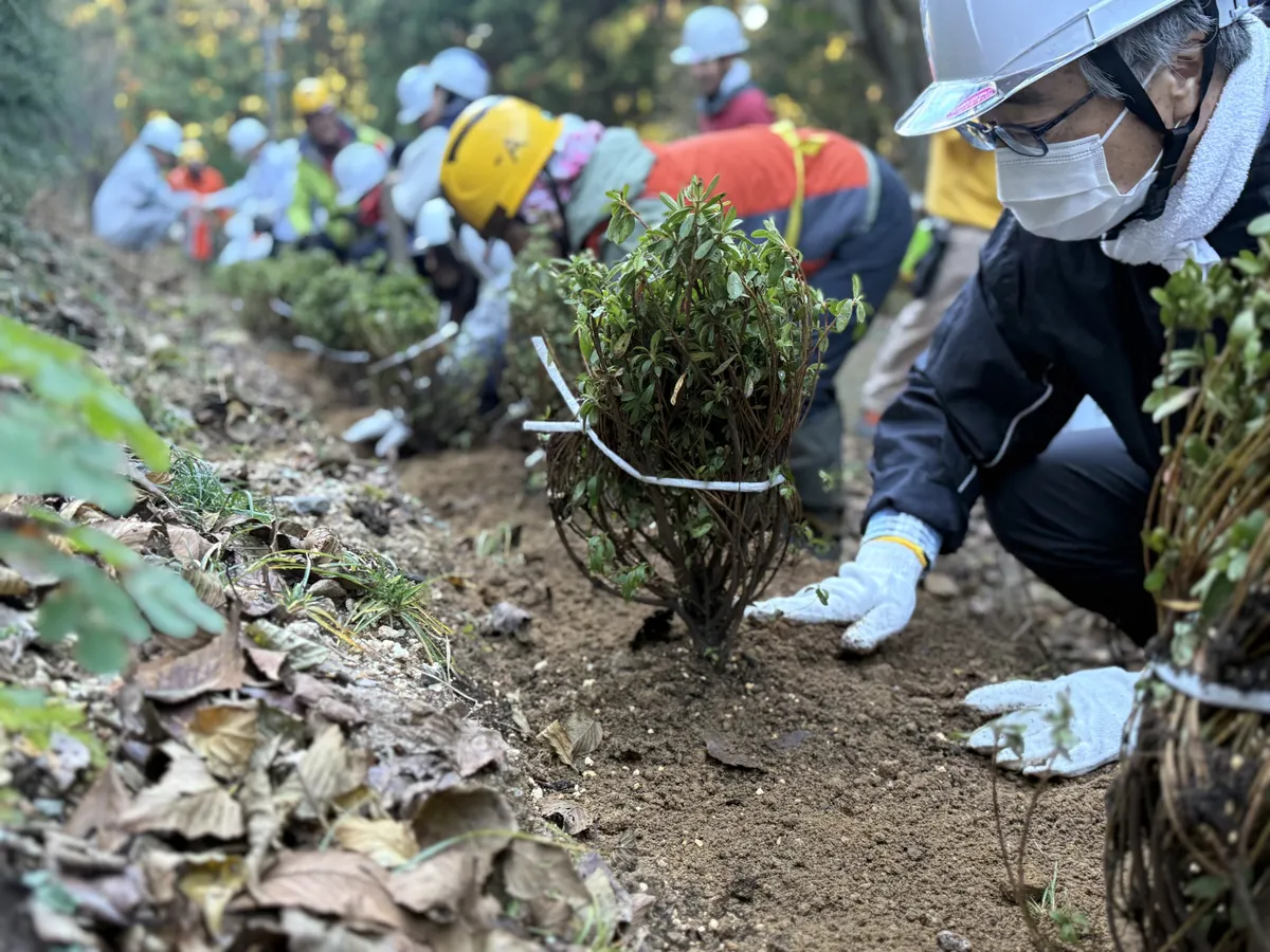 次は植樹です。今回はサツキの木を植えていただきました。みなさんに植えていただいた場所は普段コメダ社員が森の活動をする際に必ず通る道なので、活動の時に花が見られるといいな、と今から楽しみです。