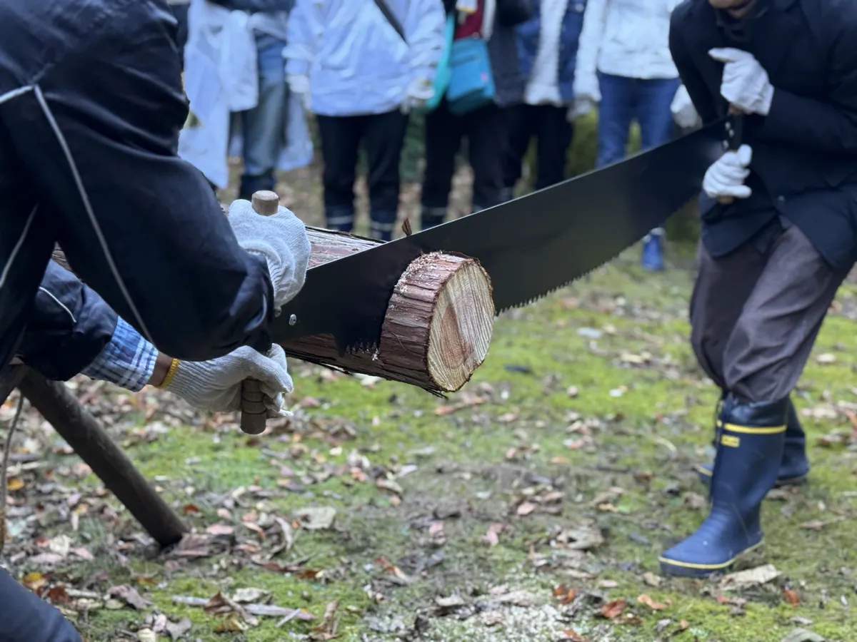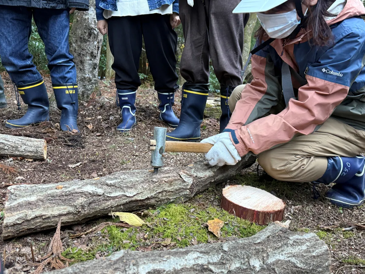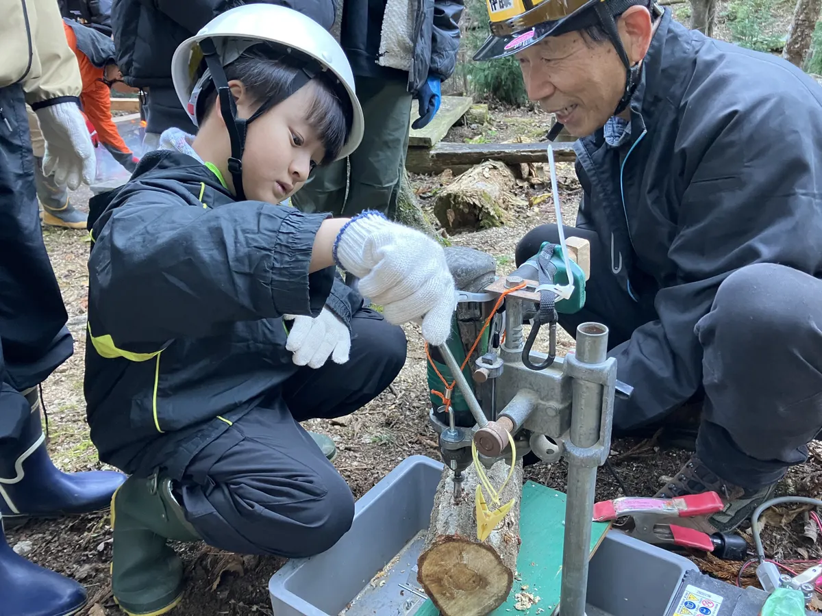 植樹後はシイタケの菌打ち体験や丸太切り体験をしていただきました。こちらは菌打ちをするための穴をあけているところ。