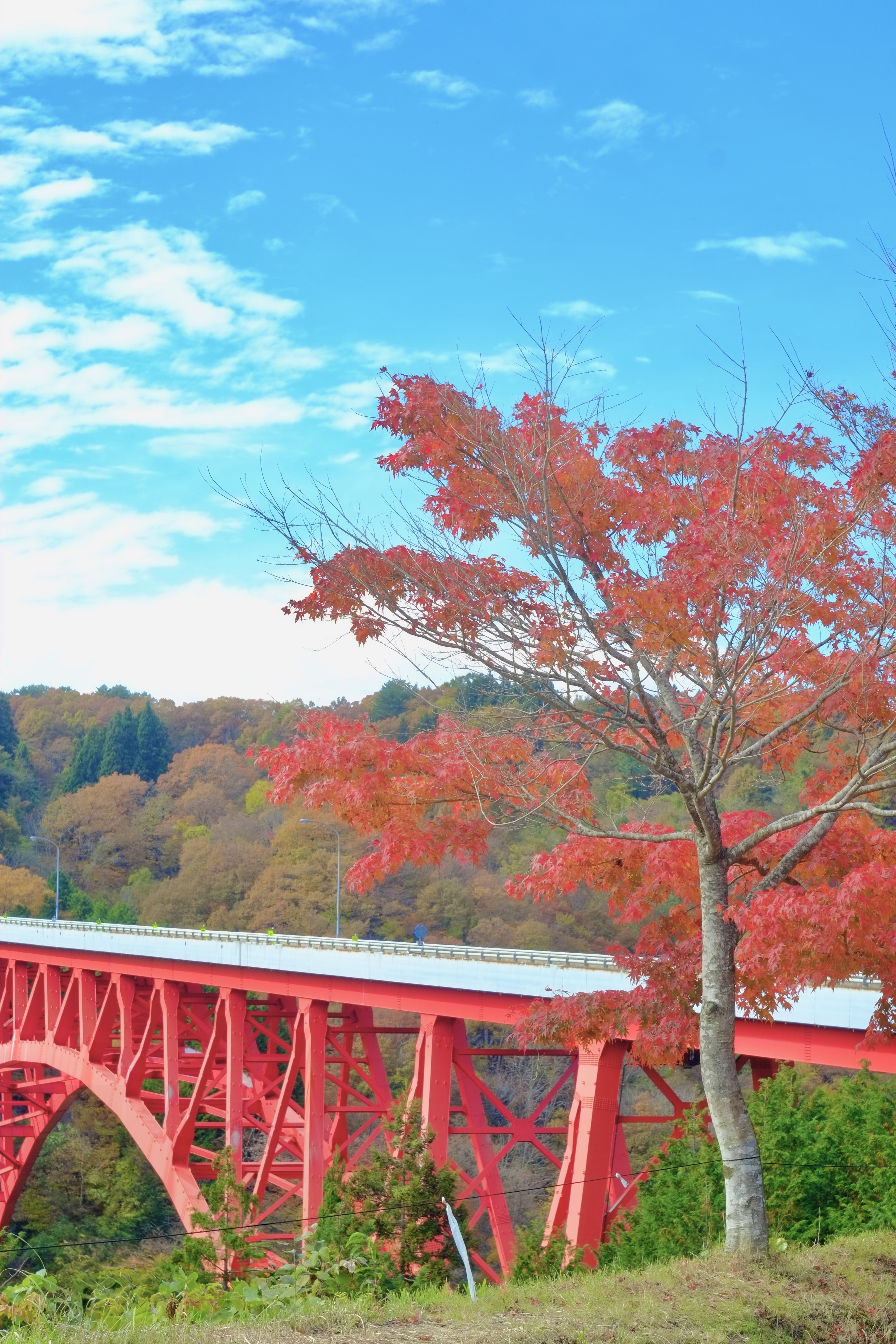 初冬の透き通った空と真っ赤に塗られた橋脚が🍁紅葉に映えて澄んだ空気感が感じられます