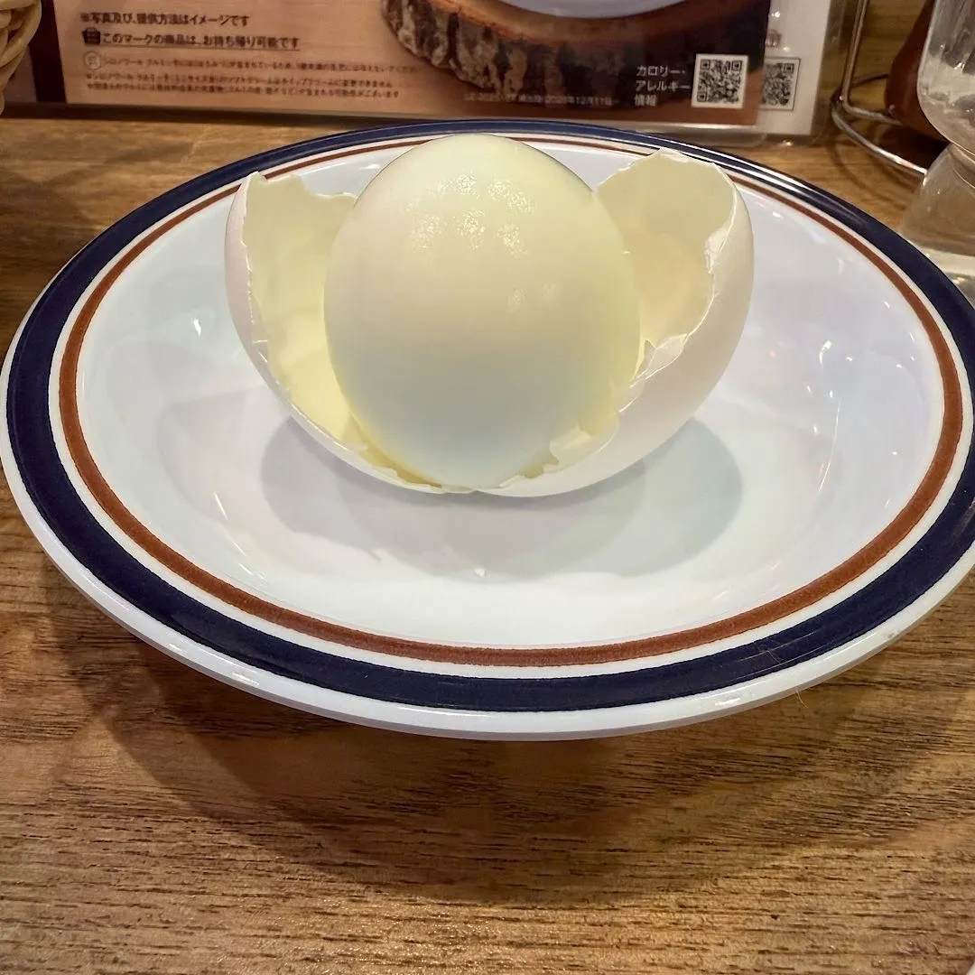 ①番の山食パンぬる豆乳に定番ゆで玉子、ミニサラダを追加