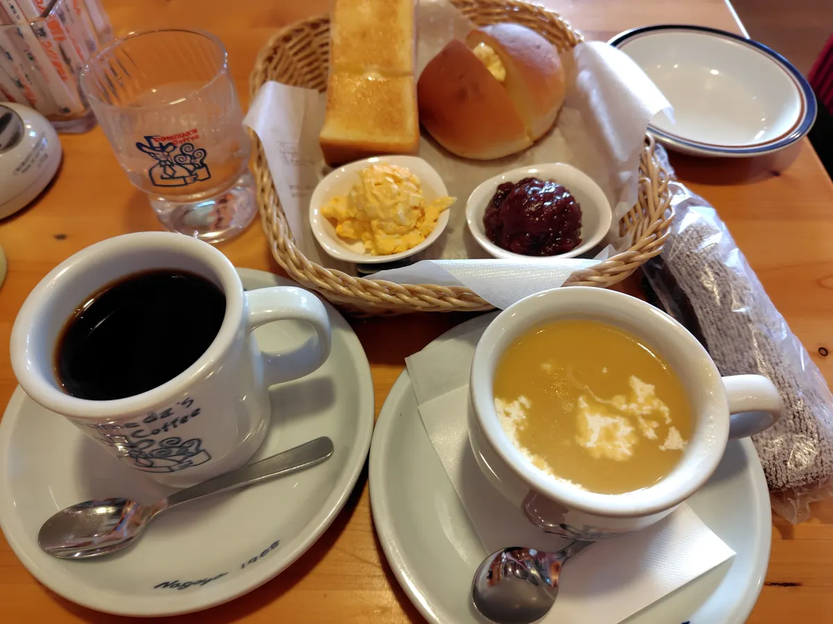 投稿を表示ゴマゴマさん、あけましておめでとうございます。今年もよろしくお願いいたします。コーンスープにブレンド、トーストにローブパン、美味しそうです。