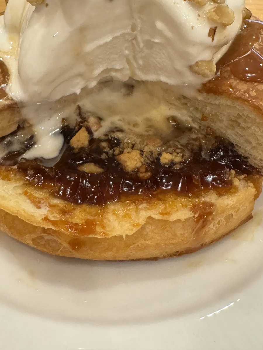 ほっかほかデニッシュなのでソフトクリームが溶けて来て見えにくいですが、キャラメルペーストがそのまんまクルミッ子⁉️