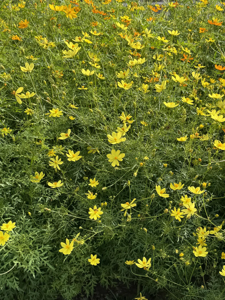 黄花コスモスは真夏から咲いていて、日照り続きで枯れてしまうかと思ったら見事に復活して、今まで以上に一面のお花畑になっていました💛🧡💛。