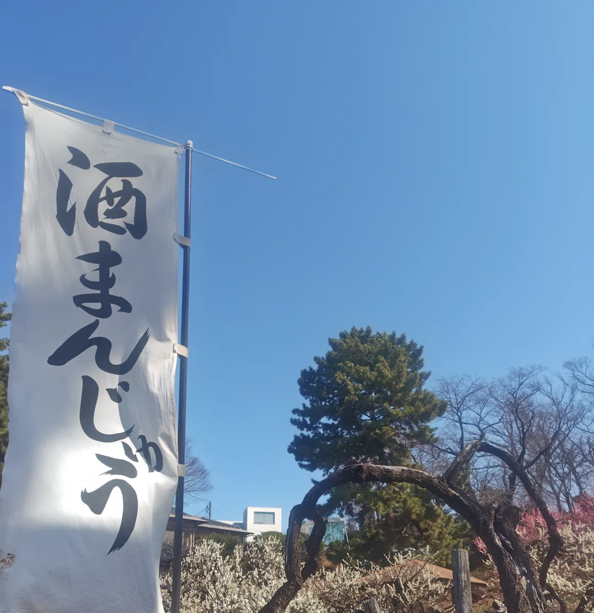 青空の中の紅白の梅がとても綺麗🌸✨ってうっとりしていたら、美味しそうな酒まんじゅうの幟旗がっっ😍❣️