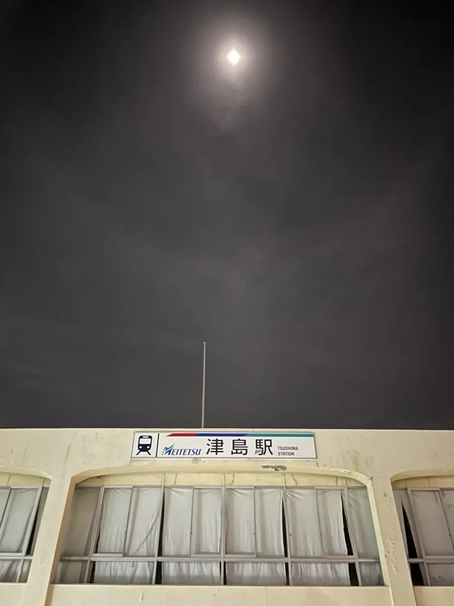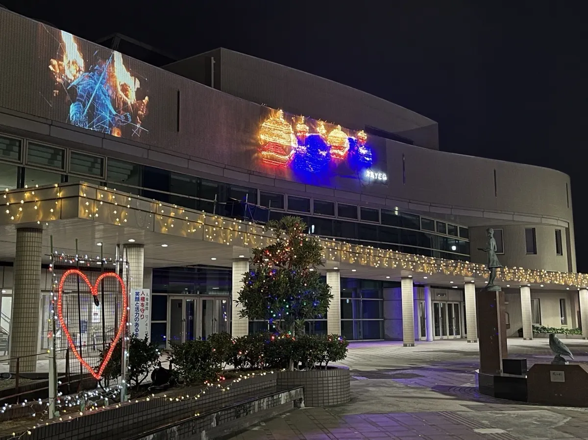 帰りは、何年か前に演奏会で訪れた文化会館の前を通って駅へ戻りました。冬らしいイルミネーションと、壁面に映し出された巻藁船がきれいで、月がちょうど真上に掛かった駅は、もっと明るく、きれいでした。