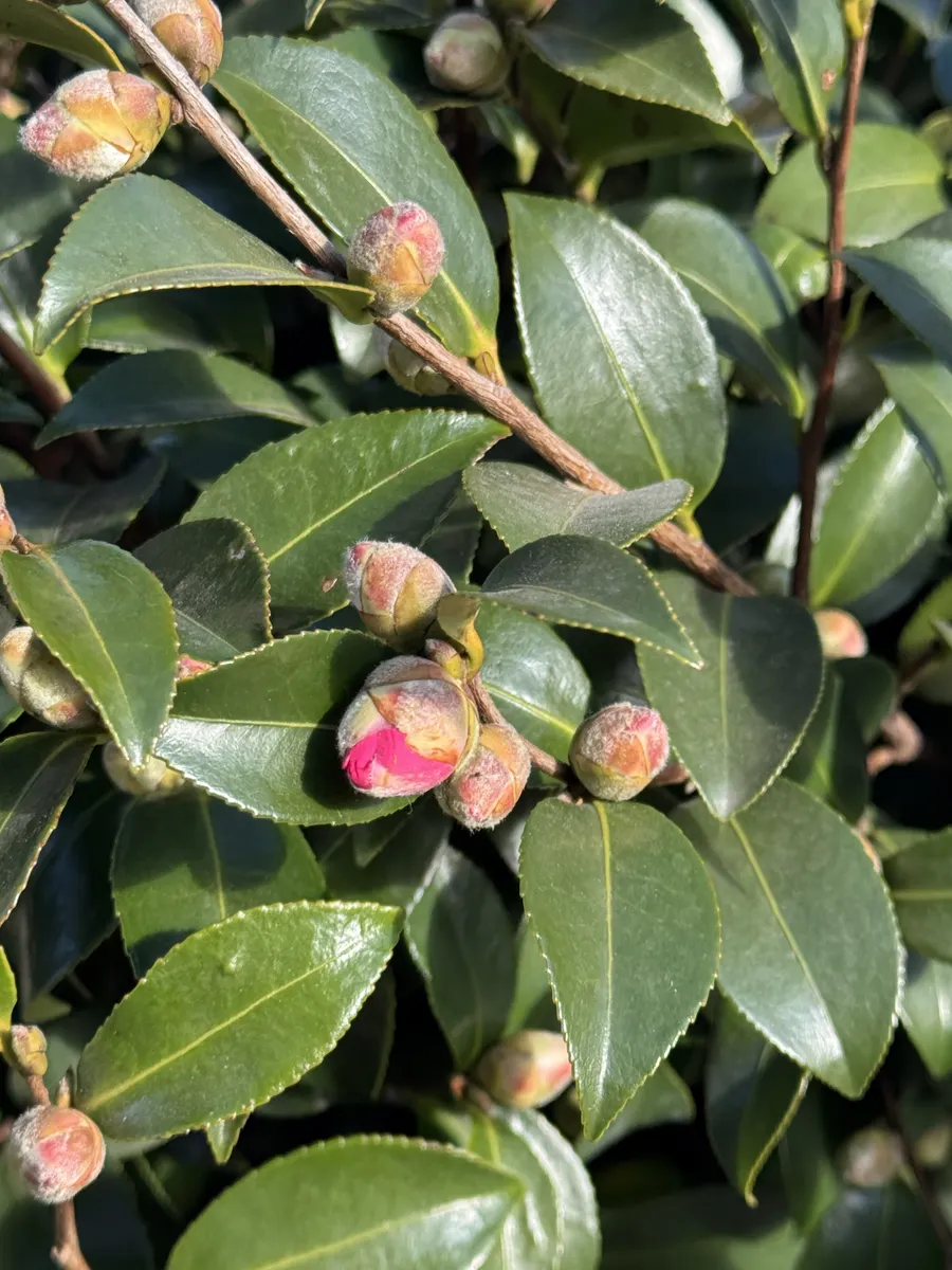 職場に向かう途中のまだつぼみのサザンカの植え込み、やっとお花の色が見え始めました🌸。