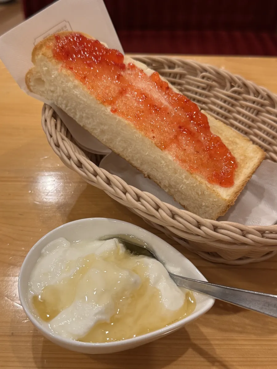 こんがりトーストにジャムトースト、ヨーグルト、美味しそう。