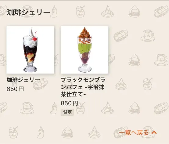 アプリから見ると、パフェは珈琲ジェリーの部類になるのでデザートセットの対象ではないようですね。