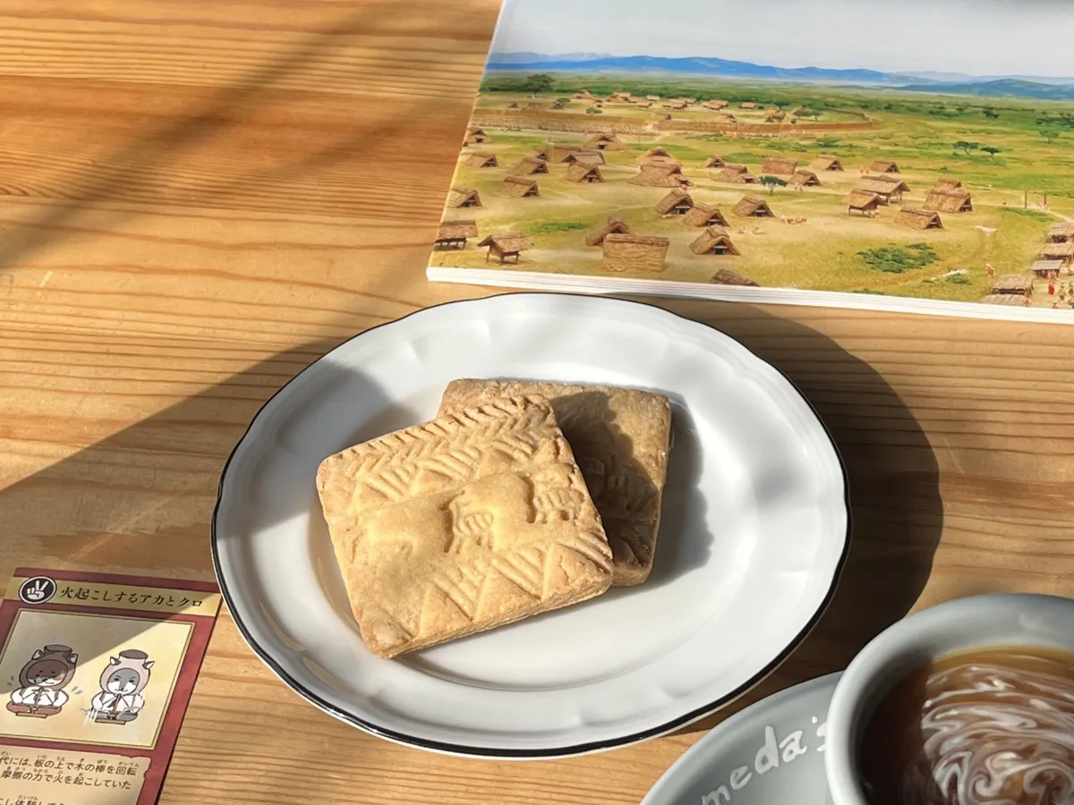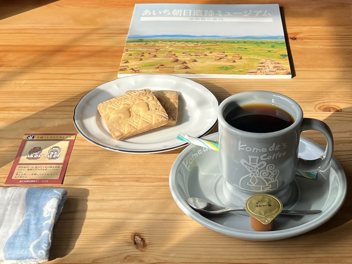 円窓から飛び出た様子の二匹の犬は、弥生時代に東海地方最大の集落が営まれた、愛知県清須市と名古屋市西区にまたがる朝日遺跡を紹介する博物館「あいち朝日遺跡ミュージアム」のマスコットキャラクター、アカとクロです。彼らの描かれた絵葉書が、黄色と白と、ミュージアムショップに二種類ありました。