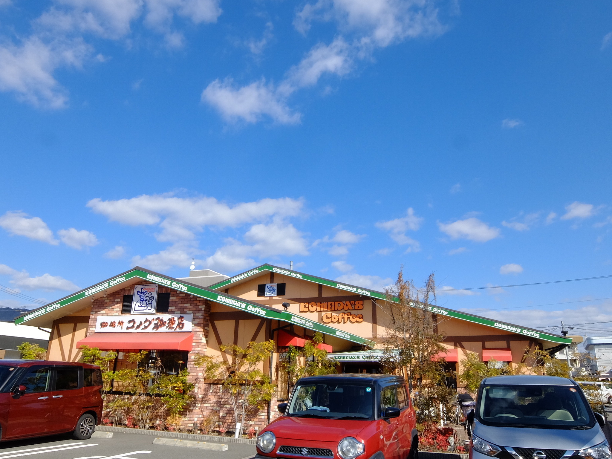 冬の青空🟦に白い雲☁️とさんかく屋根のコメダ‼️
