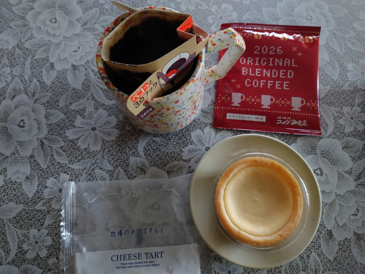 トップ > コメダ写真館 > 本日のおやつ みいこ 2026/01/05 15:55 本日のおやつ 朝、コメダおやつモーニングにして、午後来客があり、お昼は食べ損ねた。なので、今、おやつとお昼を兼ね福袋に入っていたコーヒーを頂いております。 ドリップコーヒー。今年の福袋に入っていた物。 来年未年にも使えそうなデザイン。 鬼に爆笑されそうですがウールの柄が素敵♥️ チーズタルトは、お土産♪ ちょっと甘い物摂り過ぎかな? ま、夕食はそばにでもしてみようかな。 いいね 共有する 共有する X facebook LINE リンクをコピー コメントする 2 件の返信 (新着順) ミュートしたユーザーの投稿です。 投稿を表示 やっちゃん 2026/01/05 17:33 美味しそうです♪ いいね 返信する ミュートしたユーザーの投稿です。 投稿を表示 みいこ 2026/01/05 20:30 やっちゃん 今晩は。 お土産で頂いたチーズタルトです。ブルーベリージャムが良い味出しています。 チーズ好きなので、たまりません♪ いいね 返信する ミュートしたユーザーの投稿です。 投稿を表示 のりべ 2026/01/05 17:10 みいこ みいこさん、こんばんは😄 私もおうちコメダも楽しんでますよ おやつにドリップコーヒー 今はしるこサンドがお気に入りで、マイコメ行く度に買ってしまいます(笑) おうちでもコメダ感満載で楽しいですね~😄🎵🎵🎵 いいね 返信する ミュートしたユーザーの投稿です。 投稿を表示 みいこ 2026/01/05 20:26 のりべ 今晩は。 おうちコメダ良いですね~ 今年は、特に楽しんでおります。 今回のお菓子、美味しゅうございました。 マイコメでは、バウムクーヘンとクッキーが販売していないので、今回の福袋に入っていたので楽しめました。 いいね 返信する