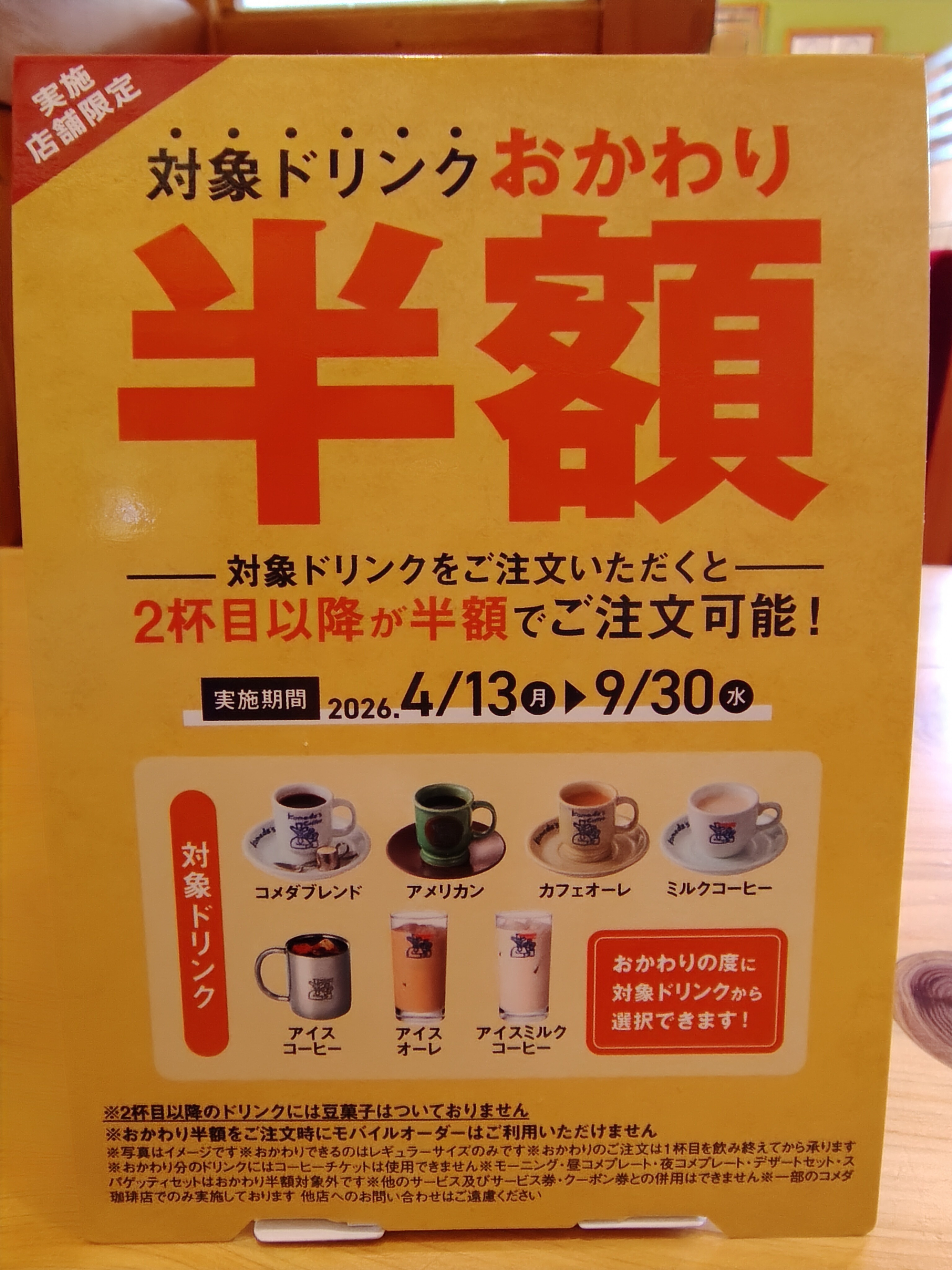 対象ドリンク:コメダブレンド、アメリカン、カフェオーレ、ミルクコーヒー、アイスコーヒー、アイスオーレ、アイスミルクコーヒーが対象です