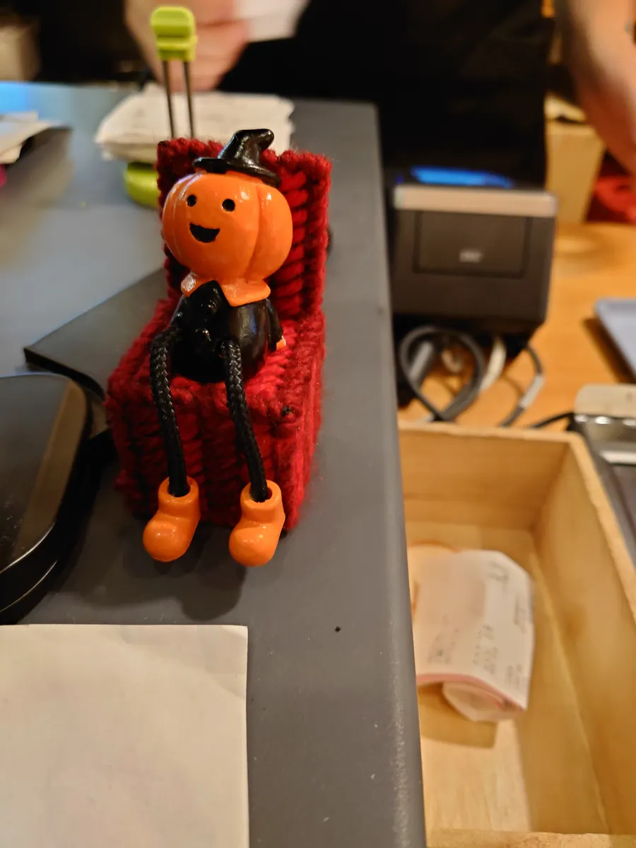 でも、この前来た時に、レジのお兄さんが作った椅子が有り、この前は、かぼちゃが着席。そしてもう1つ同じ色でスツールみたいのも増えていました。