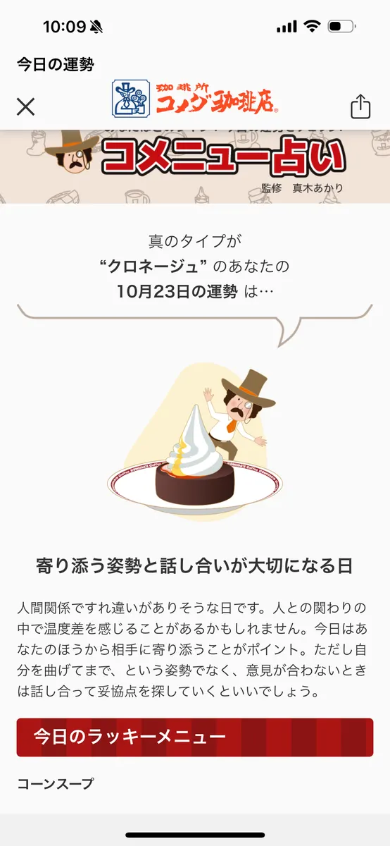 トップ > コメダ写真館 > コーン🌽スープモーニング🎶 うさごん 2025/10/23 12:39 コーン🌽スープモーニング🎶 肌寒い朝なのに半袖のTシャツを着てきてしまったので、朝食はあったかいコーン🌽スープでモーニング🎶 店内大盛況で、ここだけやっと空いたカウンター18番席。 コメニュー占いのラッキーメニューもコーン🌽スープでした😊。 良い事があるかな🤭✨。 ゆでたまご🥚さん、少し窮屈そうだけどモーニングトースト🍞とツーショット❤️。 仕事が休みなので、曇り空の森林浴を楽しんでこようと思っていま〜す٩( 'ω' )و💕 いいね 共有する 共有する X facebook LINE リンクをコピー コメントする 10 件の返信 (新着順) ミュートしたユーザーの投稿です。 投稿を表示 みさ♡ 2025/10/27 00:20 🔌充電ヨシ✨ いいね 返信する ミュートしたユーザーの投稿です。 投稿を表示 のりべ 2025/10/24 19:08 うさごん うさごんさん、今日のラッキーメニュー参考にするのいいですね😉❇️❇️ 運が上がりそうです😄⤴️⤴️ きっといいことありますね🍀 いいね 返信する ミュートしたユーザーの投稿です。 投稿を表示 帰ってきたカフェインマン 2025/10/23 21:48 ふっくら食パン🍞メチャ美味しそう。😋 いいね 返信する ミュートしたユーザーの投稿です。 投稿を表示 うさごん 2025/10/24 01:09 帰ってきたカフェインマン 帰ってきたカフェインマンさん、 こんばんは😃。 外はサクサク、中はふんわり、バター🧈は流れ落ちるような盛り盛りでは無かったけれどひと口食べるとバターがじゅわ〜、今朝はLL玉?ってくらい大きめなゆでたまご🥚さんと一緒にいただいたら、最高に美味しかったです😋。 寒くなってくると、熱々のコーン🌽スープと1番モーニングも良いですね👍。 コメントありがとうございます🍂。 金曜日も素敵💓な一日をお過ごしください🥰💕。 いいね 返信する ミュートしたユーザーの投稿です。 投稿を表示 いだっち 2025/10/23 21:09 モーニングにコーンスープを選んだら、ぜひトーストをスープにつけて、つけパンにして食べてみてくださーい🌽飲むとはまた違った味わいが楽しいですよ😋 いいね 返信する ミュートしたユーザーの投稿です。 投稿を表示 うさごん 2025/10/24 01:03 いだっち いだっちさん、こんばんは😃。 コーン🌽スープのつけパン🍞、美味しいですね🎶 同じコーン🌽スープのはずなのに、いだっちさんがおっしゃる通り不思議なくらい味わいの変化が楽しめますね🥰。 つけゆでたまご🥚もとっても美味しいので、コーン🌽スープを注文した時には色々試して浸していただいております😘。 最後にパンをひとかけ残しておいて、カップの底に残ったコーン🌽スープを付けると、美味しいコーン🌽スープが残らずいただけるので、最後の締めを楽しんでいます😄💕。 コメントありがとうございます🍂。 金曜日も素敵💓な一日をお過ごしください🥰💕。 いいね 返信する ミュートしたユーザーの投稿です。 投稿を表示 いだっち 2025/10/25 11:38 うさごん パンでスープを最後まできれいにいただく技、真似させていただきます😋🌽🍞あ〜、早くモーニングに行きたいなあ〜 いいね 返信する ミュートしたユーザーの投稿です。 投稿を表示 コーン 2025/10/23 17:43 うさごんさん、こんにちは😃 今日のラッキーメニュー❣️コーンスープでモーニング☺️🌽 トーストとゆで玉子も美味しそうです。 コーンスープ、たっぷり入っていて嬉しいですね☺️ いいね 返信する ミュートしたユーザーの投稿です。 投稿を表示 うさごん 2025/10/24 00:47 コーン コーンさん、こんばんは😃。 ラッキーメニューがコーン🌽スープだ〜💛✨って思った時に、最初に浮かんだのがコーンさんでした😄🎶 もしかしてコーンさんのコメニュー占いもコーン🌽スープだったら嬉しいなぁって思いながら飲みました😊。 フレッシュはキッチンスタッフさんがかけてから持ってきてくださるので、このフレッシュアートは何だろう🤔って色々想像💭を巡らせながらいただきました😉。 なみなみ注いでもらって、本当に嬉しかったです😍💗。 猫🐈舌なので、しばらく幸せな気持ちでコーン🌽スープを見つめていました❤️✨。 ゆでたまご🥚さん、今朝はLL玉?ってくらい大きくて、食べ応えも最高❣️トースト🍞もサクフワでとっても美味しかったです🎶 コメントありがとうございます🍂。 金曜日も素敵💓な一日をお過ごしください🥰💕。 いいね 返信する ミュートしたユーザーの投稿です。 投稿を表示 コロン 2025/10/23 16:31 うさごんさん こんにちは😃 1日の始まりを、ラッキーメニューのコーンスープ🌽で✨️ 良い1日になりそうですね😌 いいね 返信する ミュートしたユーザーの投稿です。 投稿を表示 うさごん 2025/10/24 00:35 コロン コロンさん、こんばんは😃。 今日一日の吉凶を占おうと思って、ふとラッキーメニューを見たらコーン🌽スープだったので、一気に気分はコーン🌽スープ🎶 急に寒くなってきたので、熱々