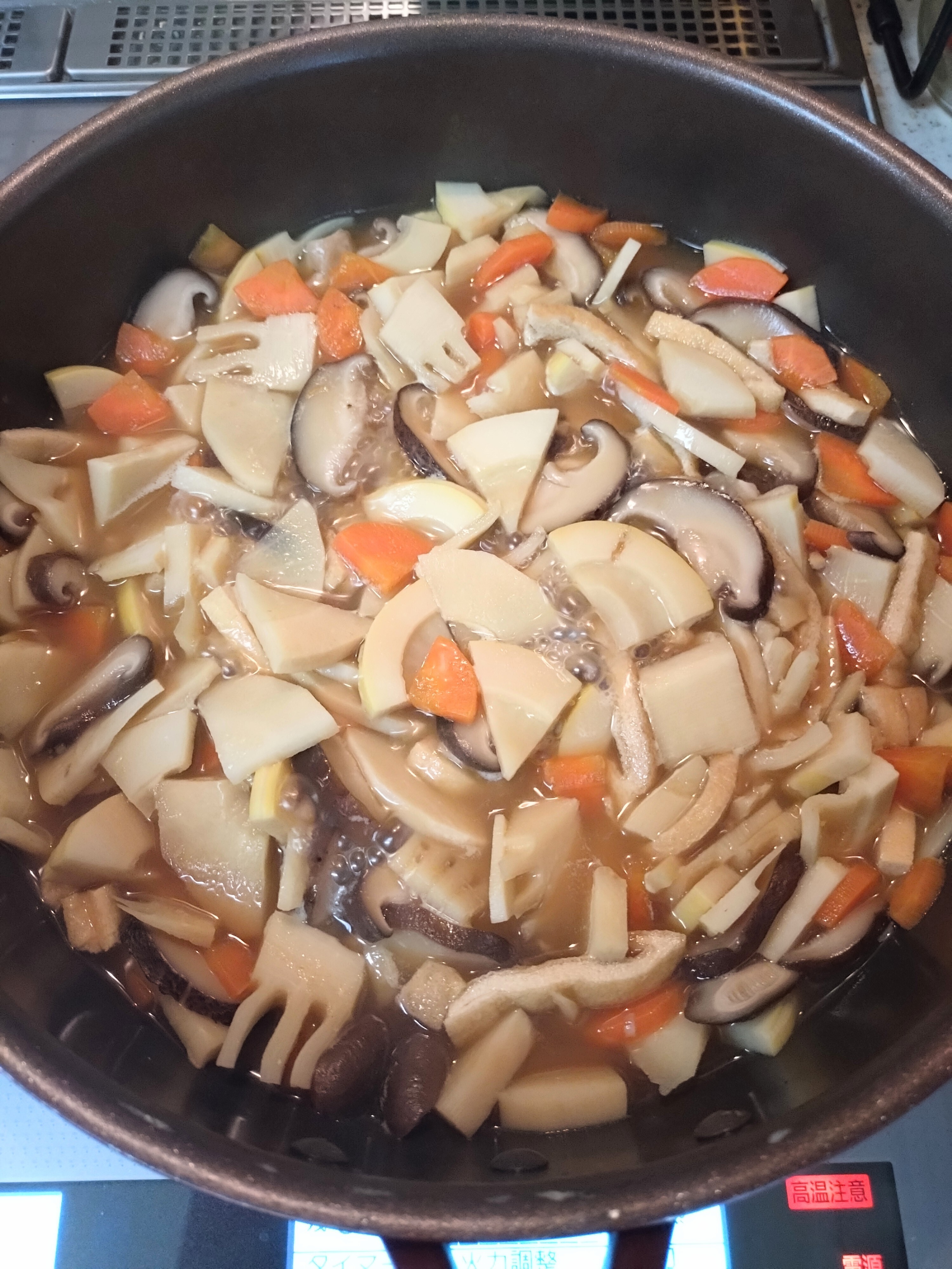 まずは筍、人参、椎茸、油揚げを煮ます。