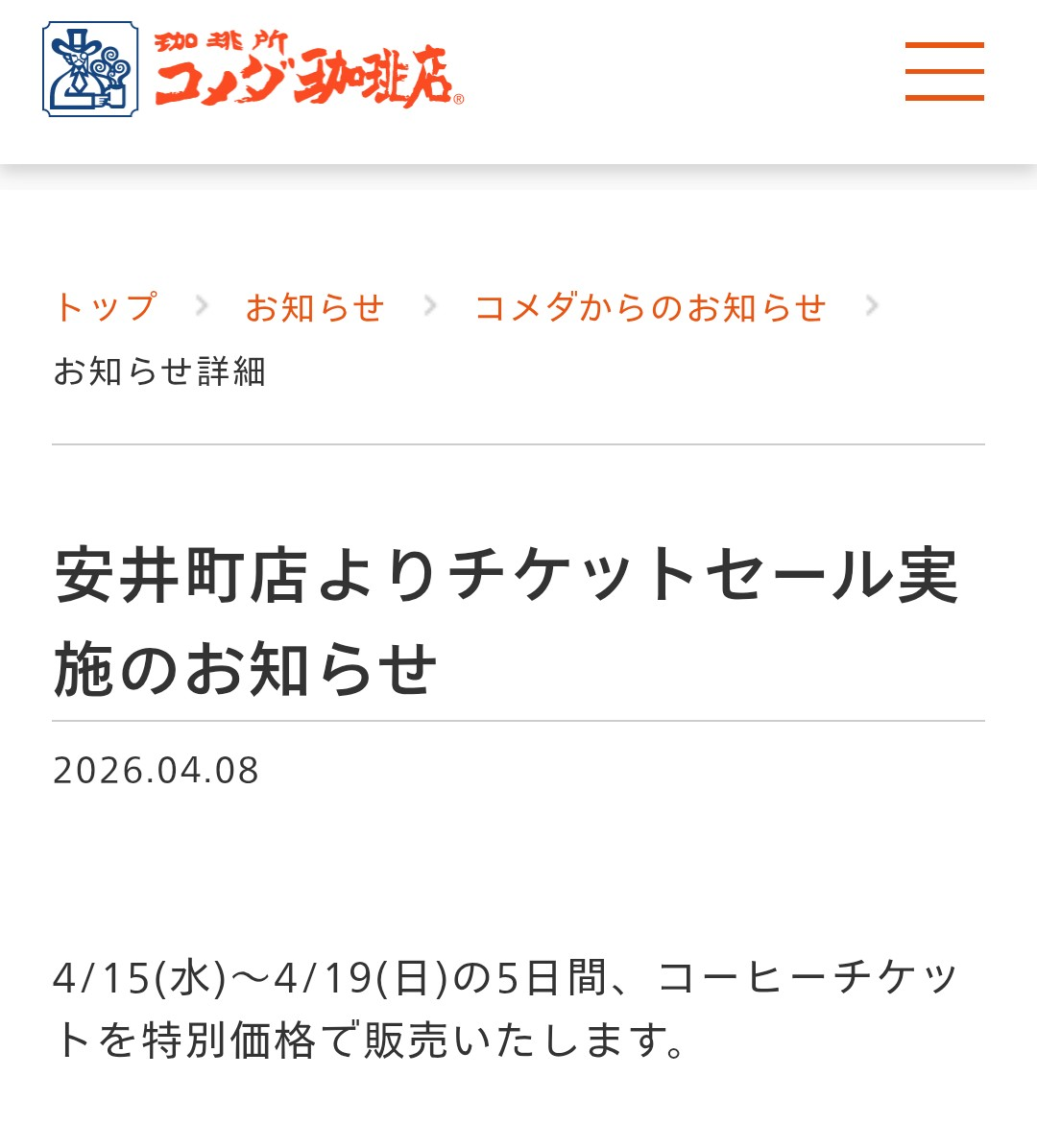 トップ > コメ友の部屋 > 今日のコメダ場 > ✨️チケットセール✨️児玉店 4/15(水)... おなかすいた 2026/04/11 12:07 <p>✨️チケットセール✨️</p><div class="se-component se-image-container __se__float-none"><figure><img src="https://community.dl-asobica.com/public/uploads/ckeditor/pictures/1093209/ce7a31f0-3a73-4181-bfa3-adea65b1658a.jpg" alt="" data-rotate="" data-proportion="true" data-size="," data-align="none" data-percentage="auto,auto" data-file-name="ce7a31f0-3a73-4181-bfa3-adea65b1658a.jpg" data-file-size="undefined" data-origin="," origin-size="3072,4096" style=""></figure></div><p>児玉店 4/15(水)〜4/19(日) </p><p>9枚綴り 4200円→3700円 </p><p><br></p><p>4/15(水)にリニューアルオープンする安井町店も同期間にチケットセールするみたいですが値段は不明です</p><div class="se-component se-image-container __se__float-none"><figure><img src="https://community.dl-asobica.com/public/uploads/ckeditor/pictures/1093211/9dfd6d54-78a6-4da4-9c05-a5b1b9d5f6de.png" alt="" data-rotate="" data-proportion="true" data-size="," data-align="none" data-percentage="auto,auto" data-file-name="9dfd6d54-78a6-4da4-9c05-a5b1b9d5f6de.png" data-file-size="undefined" data-origin="," origin-size="1080,1196" style=""></figure></div><p><br></p><p>コーヒーチケット 名古屋市では下記5店舗共通です♪</p><p>・児玉店(名古屋市西区)</p><p>・安井町店(名古屋市北区)</p><p>・尼ヶ坂店(名古屋市北区)</p><p>・平安通店(名古屋市北区)</p><p>・メッツ大曽根店(名古屋市東区)</p><div class="se-component se-image-container __se__float-none"><figure><img src="https://community.dl-asobica.com/public/uploads/ckeditor/pictures/1093210/464abd79-a2ea-405a-b27f-4a3f6b037e89.jpg" alt="" data-rotate="" data-proportion="true" data-size="," data-align="none" data-percentage="auto,auto" data-file-name="464abd79-a2ea-405a-b27f-4a3f6b037e89.jpg" data-file-size="undefined" data-origin="," origin-size="3072,4096" style=""></figure></div><p><br></p> ✨️チケットセール✨️ 児玉店 4/15(水)〜4/19(日) 9枚綴り 4200円→3700円 4/15(水)にリニューアルオープンする安井町店も同期間にチケットセールするみたいですが値段は不明です コーヒーチケット 名古屋市では下記5店舗共通です♪ ・児玉店(名古屋市西区) ・安井町店(名古屋市北区) ・尼ヶ坂店(名古屋市北区) ・平安通店(名古屋市北区) ・メッツ大曽根店(名古屋市東区) いいね 共有する 共有する X facebook LINE リンクをコピー トークにコメントする 2件のコメント (新着順) ミュートしたユーザーの投稿です。 投稿を表示 タダ 2026/04/11 18:59 おなかすいたさん、こんばんは。 チケットセール、いいですね。 平安通もあるから、買いに行こうかな。 明日も良い一日をお過ごしください。 いいね 返信する ミュートしたユーザーの投稿です。 投稿を表示 おなかすいた 2026/04/11 20:00 タダ タダさん、こんばんは🌿 チケットセールの情報GETしました💪🤓 児玉店も系列店なのに「コメダからのお知らせ」には安井町店だけ載っているの何故なのか謎です🧐 タダさんも 明日も素敵な時間をお過ごしください☺️ いいね 返信する ミュートしたユーザーの投稿です。 投稿を表示 HIRO 2026/04/11 12:21 おなかすいた 🎫 チケットセールラッキー完璧👍✨ いいね 返信する ミュートしたユーザーの投稿です。 投稿を表示 おなかすいた 2026/04/11 12:48 HIRO HIROさん、こんにちは🌿 チケットセールの情報を得れて嬉しいです😍 Instagramを覗いたら安井町店もコーヒーチケットの値段 同じみたいです🎵 いいね 返信する