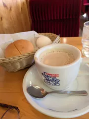 本日はモーニング間に合いました😀定番のミルクコーヒーとローブパン&茹で卵で栄養チャージです😊
