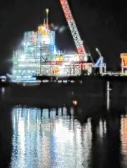 こんにちは 数ヶ月ぶりに 橋の進み具合を見学に行ってきました (18:47) 対岸には橋脚が出来てて 1年5ヶ月後に完成予定日です 昨夜から朝方まで お天気が悪く 雨の中 かすんで見える作業景色 乙なものでしたよ