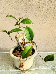 こんにちは 8月~9月 手術入院でテラスの植物たち心配してたんですが 今回は ネットで見た ペットボトルに綿棒で水補給と 途中台風接近で 小窓を開けてるとの 理由付けで1時間の外出許可が出て どうにか生き延びてくれてました 椿 葉っぱは病気なのか? 虫食いなのか?可哀想