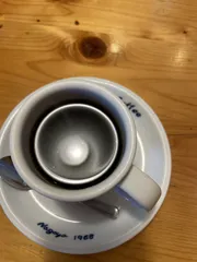 ソーサーのコメダおじさん やっぱりソーサーのおじさんは右利きでした。今日のブレンドのカップの中身☕️これが写り込んでるの❣️
