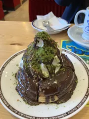 お初です‼️ 曇天の土曜日です!ちょっと寒いかも😨 やっと、漸く頂きました❣️シロノワールブラックモンブラン-宇治抹茶仕立て‼️ ソフトクリームがクランチ、チョコソース抹茶で覆われてて、パリ!サク!ザク食感のチョコクランチが大き過ぎて🥄、フォークでは素直にソフト迄行けず、お行儀悪いですが手を使