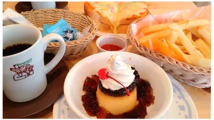久しぶりに来ましたわいつのまにプリンなんて増えたのかわいい!コーヒーゼリーも添えられててお得感ポテトバスケットさんあいかわらずもりもりしてわねお連れ様には私の推しのたっぷりたまごのピザトーストを薦めましたわあいかわらずたっぷりすぎる
