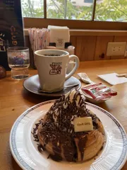 初オーダー いつものデザートセット、ミニサイズが売り切れって言われて…えーって思いながら初のレギュラーサイズを注文💦思わず「でかっ」👀1人で食べれるか心配やったケド、何とか完食😁どうしてもチョコフレークが口周りに付いてしまって、ひと口ごとにお口拭き拭きしないと😅お腹も心も満たされた美味しいコーヒータイムでした☕