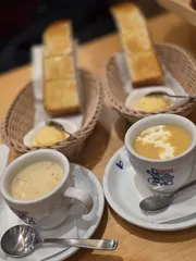 クラムチャウダー と、定番のコーンスープ。ステージMAXに復活し誕生日の朝は控えめに言ってサイコーです。皆様良き1日を。
