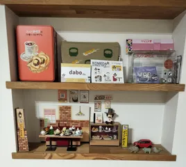 何とか完成しました😊ひとまずはこれで👍第一弾を追加したので、商品が届いたらまた改造すると思います😅全体図テーブル2個繋げてみました 本物さながらのミニチュアによだれが😋愛しのコメダンディ💖 椅子に座るとかくれんぼしちゃうので ケースの上に乗
