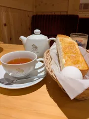瑞モーニング 早朝からいろいろと頑張ったので、ごほうびモーニング🫖🍞🥚 ソファ席に座れてうれしいな。