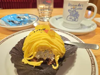 本日のデザート 本日のデザートはごまいもんぶらん です断面にて失礼します😂 鳴門金時味が、効いてごまも香ばしく とても美味しかったです モバイルスタンプ無料券でコメダブレンドいただきました☕