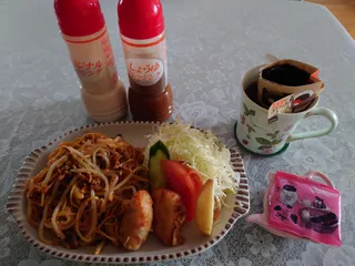 おひとり様ランチ こんにちは😃遅めのランチでインディアンスパゲッティーを久しぶりに食べたくて少し走り食べました人目が無い席でしたので広げてみました😆 大盛りに早替わり多いです汗を掻きましたが美味しく頂き満足でしたアメリカンコーヒーに豆菓子を付けて頂き 豆菓子安定数10個入りでした美味し
