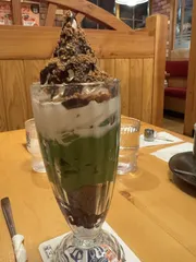 今夜のブラックモンブランパフェ−宇治抹茶仕立て−は🤎💚🤎でした❣️ ソフトクリームが見えないくらい、パリパリチョコレートでコーティングされていてとっても美味しかったです🎶