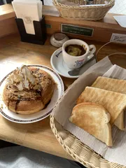 ランチタイム ミックストースト(辛子マヨ多め)、アメリカン 普段滅多に食べる事が出来ない昼コメプレートにするか、ポテサラトーストにするかホットドッグにするか、チーズカリートーストにするか、寒いからグラタン(まだ食べた事ない)にするか…食べたいものが多過ぎて迷いに迷って、ミックストーストにしました🥪丸々1