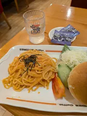 夜コメダ めんたいクリームパスタ。今日はナポリタンと悩みこちらにしました。贅沢な悩みです。
