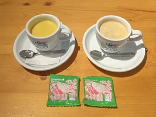 あたたかい〜飲み物 寒いので温かい飲み物✨熱いコーンスープ🌽(左)✨熱いミルクコーヒー(右) 体が温まり美味しかったよ〜🥰😊😋