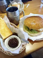 モーニング兼ランチ コメ友の皆さん こんにちは半月の入院が終わり本日退院❗️待ちに待ったモーニングに間に合いました‼️いつものコメ黒のコーヒーの美味しさ😇に満足❕ 山食パンにぬる豆乳 ゆで卵が欲しかった2週間耐えてました半月振りにコメダに寄れました😅帰りにお月見シリーズ🌕大きな《お月見フルムーンテリヤキバーガ