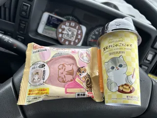今日はにゃんの日? ファミマでまんまと猫の日商戦にひっかかりました😆 でもコレだとコメダ商品にならないから…ミルクコーヒーも買ってきた😃今日はこちらで🚚トラックコメダ☕️👏👏👏 先に飲むのは黒蜜きにゃこにゃて🐱ニャン🐾