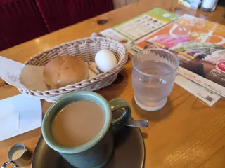 今日の1枚、今朝は寒い。 アメリカンでモーニングA、ローブパンかき氷のパウチがある。寒い~。