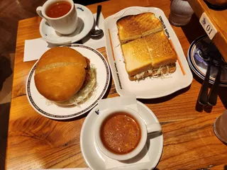初ダブルモーニング お初、ダブルモーニングしました✨️ミネストローネ、美味しくてトーストはひたパンローブパンは小倉あんをはさんで満喫♪全部いつもの右利きコメダおじさんでしたなかなか、ぎっちょおじさん出逢えない笑最後はゆで卵入れて食べてみたらおいしかったです✨️(チョットキタナクテゴメンナサイ) 昨日面接で採用