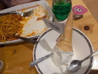 チケット 期限が今月までなので、子供と来ました。ソフトクリームとカフェインレスにチケットを使って、昼食?夕食?にナポリタンを。急ぐあまり、半分食べてからの写真になりました(汗)ここから1時間かけて、子供の習い事へ、、、