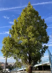 ひと本のメタセコイア 午後の日差しに色づきはじめていました。下校中の小学生にこちらから明るく挨拶すると、安心した様子の返事でおたがいなごみました。(名古屋市千種区 水の歴史プロムナード(天満緑道))