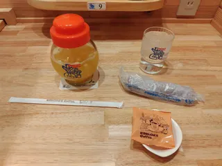ミルクコーヒー飲んでるじゃん。 チケットの上のハート型のものって、何?