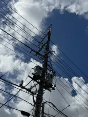 電信柱と夏の空 いつも動植物との出会いを求めて下ばかり見て歩きがちですが、見上げればあちらこちらに張り巡らされた送電線網。無機質な感じですが、鉄塔や電信柱を見るのも好きです❣️